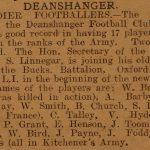 At the outbreak of war on 4th August 1914 men who had previously served as soldiers were recalled to their regiments, this included several from the Parish and these men were soon stationed in France and Belgium. Some fought at the Battle of Mons 1914, the first major battle of the Great War. It was reported in the Wolverton Express of December 1914 that 17 out of the 23 Deanshanger Football Club players had enlisted. William Bartlett was the first team member killed in action in France , December 1914.